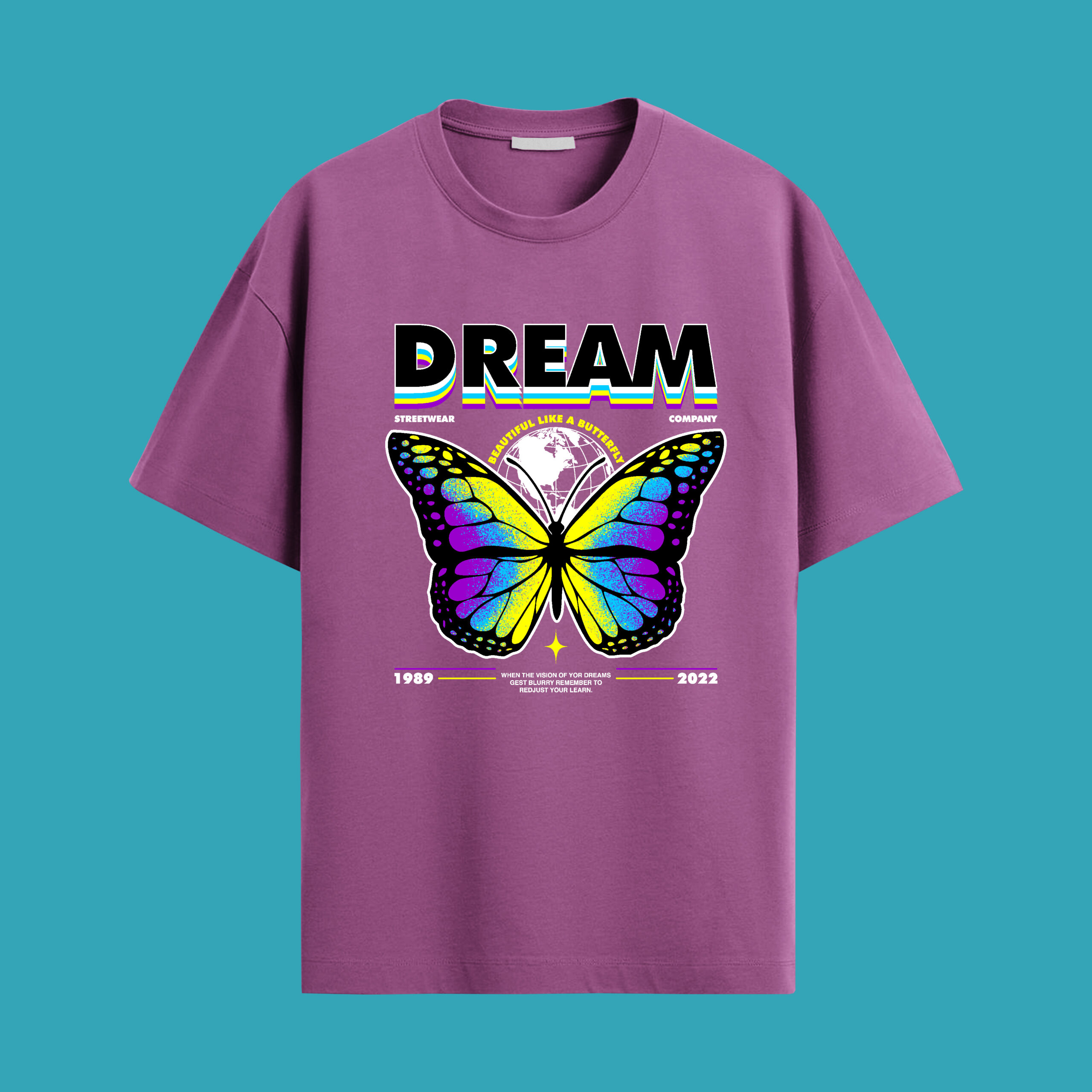 This striking oversized tee embodies pure streetwear swagger, featuring a vibrant purple color that immediately captures attention against the plain green backdrop. The front showcases a bold, eye-catching graphic print with the word “DREAM” prominently displayed, suggesting a motif of ambition and style. Paired with distressed, baggy denim shorts and chunky white sneakers, this look perfectly balances comfort with a confident, edgy aesthetic, making it an ideal statement piece for anyone looking to channel contemporary, relaxed “swag.”