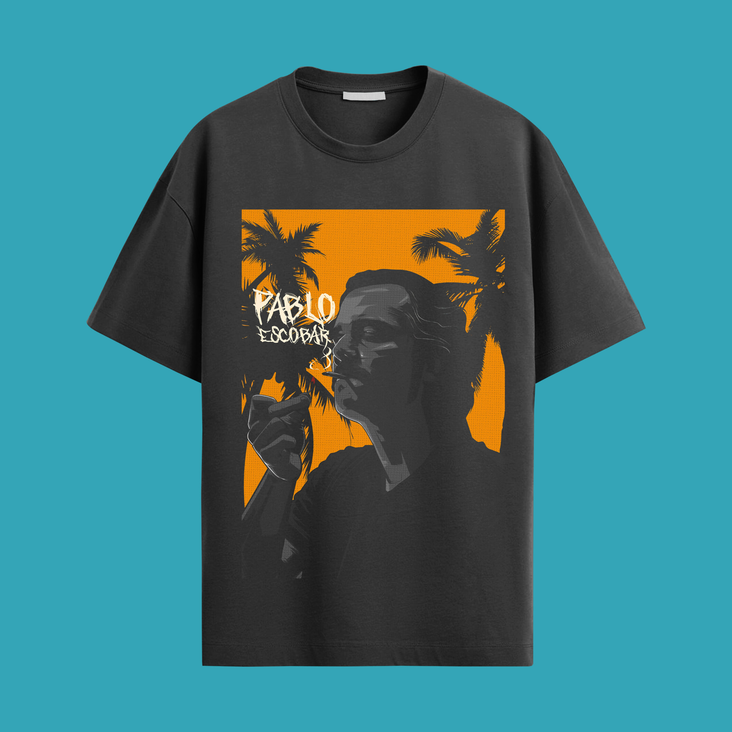 Embrace the bold and enigmatic with this oversized tee, featuring a striking Pablo Escobar graphic set against a vibrant, tropical orange and black backdrop with silhouetted palm trees. The relaxed, drop-shoulder fit captures an effortless “vibe,” making it the perfect statement piece for those who appreciate a blend of controversial pop culture and streetwear style. The deep charcoal fabric beautifully contrasts with the graphic, all set against a cool, plain green background in the photo for a clean, eye-catching presentation.