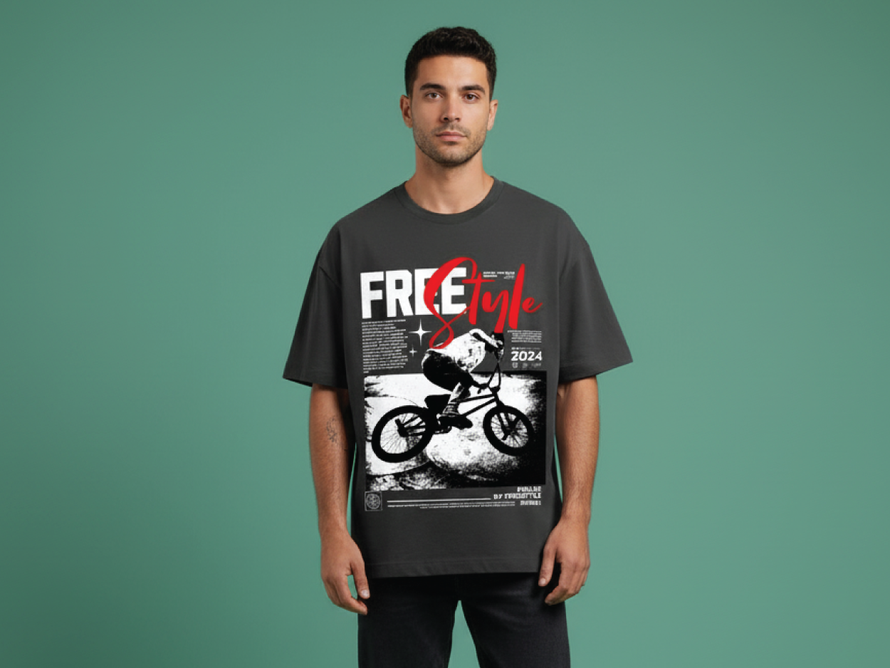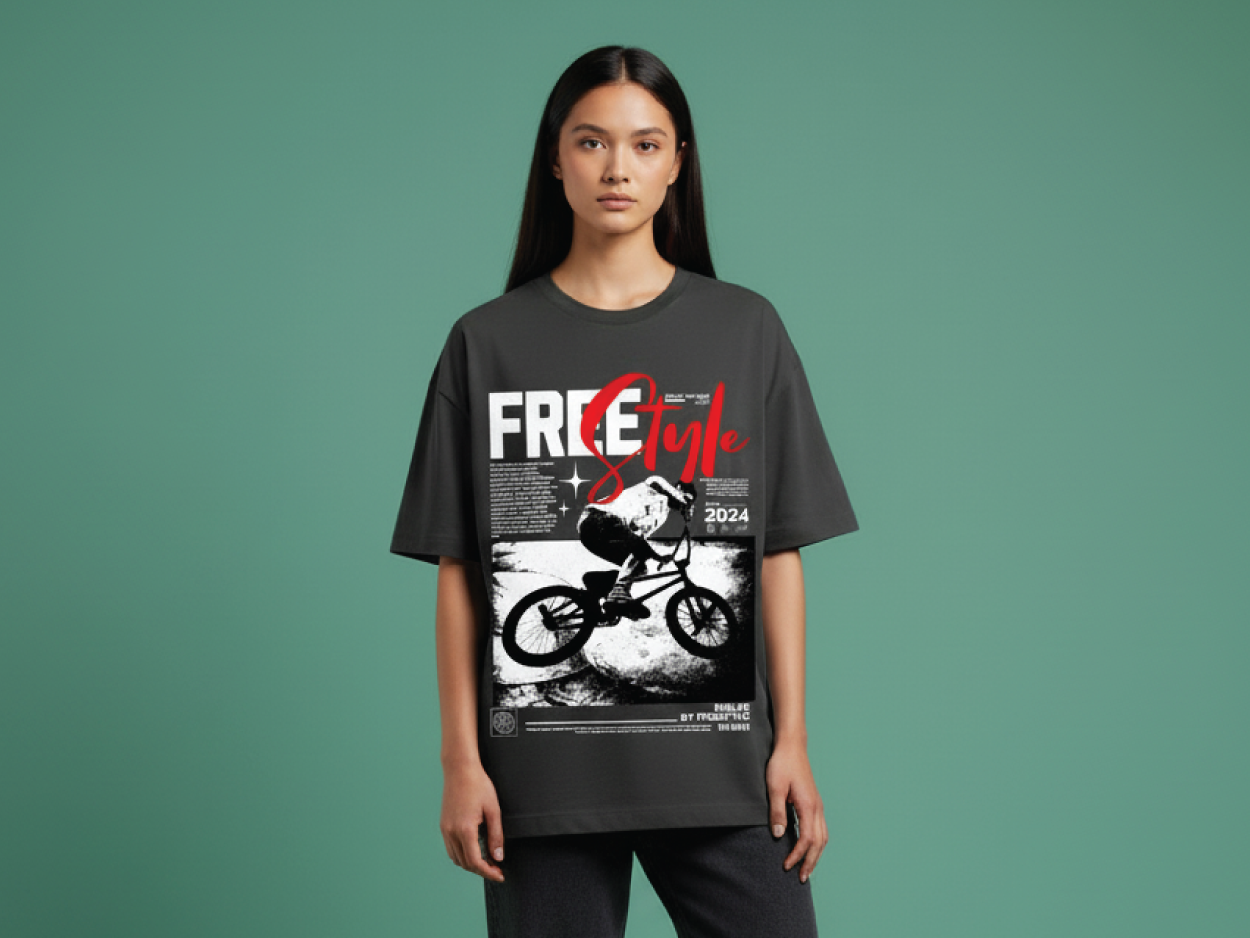 Hit the streets with the ‘Freestyle 2024’ Oversized Graphic Tee, the ultimate statement piece for those who live life in the fast lane. This charcoal/dark grey t-shirt showcases a dynamic, high-contrast, distressed graphic featuring a BMX rider in action, complete with the vibrant red “FREESTYLE” text that screams attitude. Designed for maximum comfort, the unisex oversized fit offers a relaxed, drop-shoulder look perfect for that sought-after streetwear aesthetic. Crafted from a soft, premium fabric, it’s the ideal tee to pair with everything from baggy denim to sweatpants, channeling a vibe of adrenaline, freedom, and effortless cool.