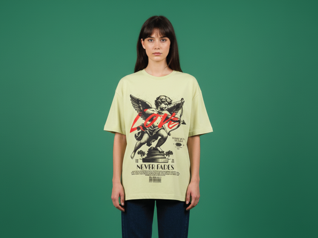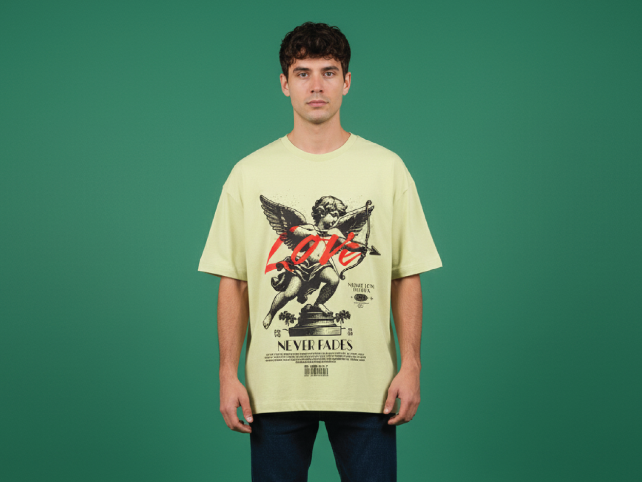 Inject an element of timeless romance and edgy streetwear into your wardrobe with this oversized graphic T-shirt. Featuring a striking, monochrome illustration of a classical Cupid statue aiming his bow, the design is boldly overlaid with the phrase “LOVE NEVER FADES” in a contrasting, distressed red typeface, capturing a message of eternal devotion with a contemporary, urban aesthetic. Crafted for a supremely comfortable and relaxed fit, this tee’s unique blend of mythological elegance and modern grit makes it a perfect statement piece that pairs effortlessly with jeans, joggers, or shorts, all set against a vibrant, solid green background for maximum visual pop.