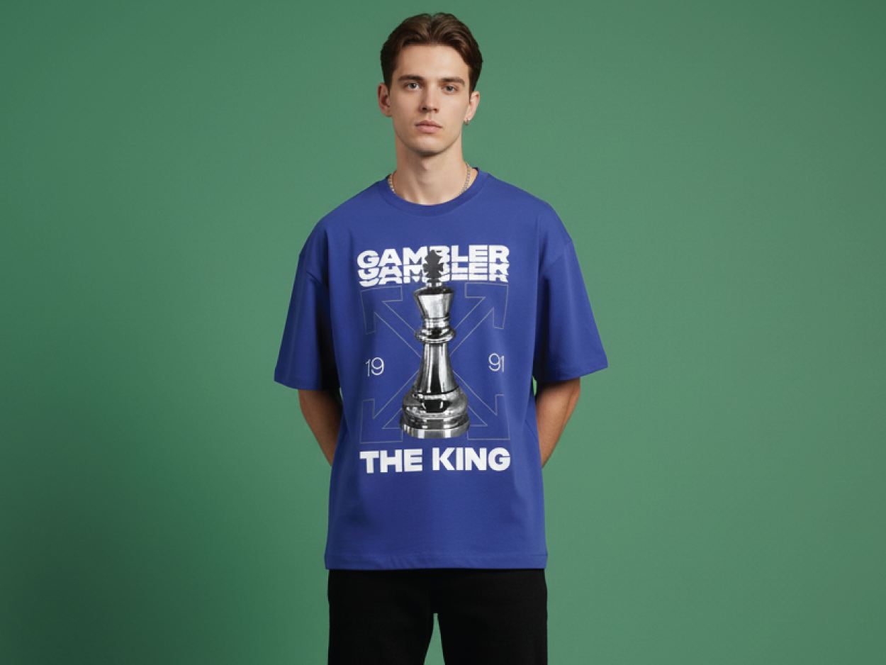 Get ready to elevate your streetwear game with this oversized blue T-shirt, designed for those who play by their own rules. The bold graphic features a commanding silver chess king piece, framed by the striking text, “GAMBLER” and “THE KING”, punctuated by the years ’19 91′. This shirt is more than just clothing; it’s a statement of confidence, intelligence, and a distinctly cool vibe. Styled on a model against a clean, plain green background, this tee offers a relaxed fit and effortlessly captures a modern, graphic-focused aesthetic, making it the perfect centerpiece for a head-turning casual look.
